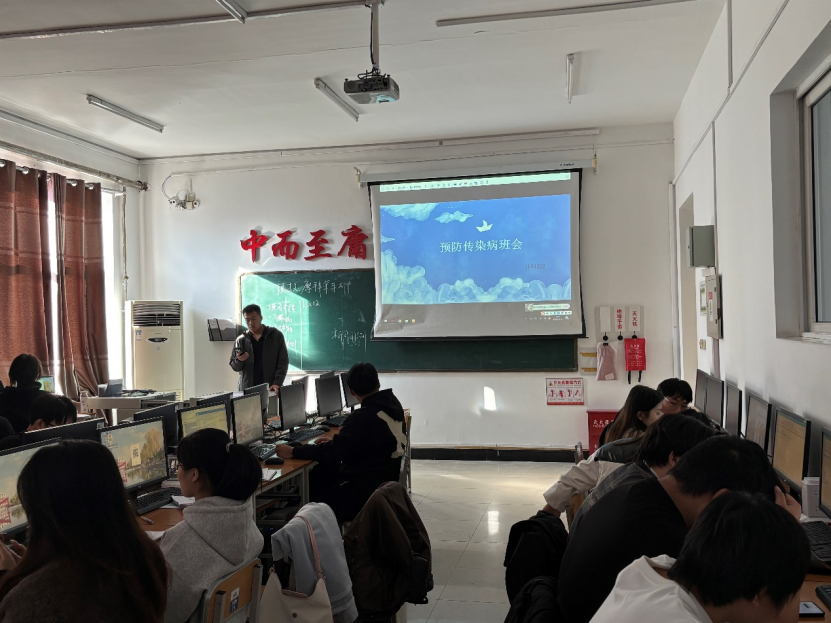 班会中,班长李佳阳结合校园防控实际,以“科学防控、健康同行”为核心,围绕季节性流感、病毒性肝炎、肺结核、狂犬病四种常见传染病,从传播特点、核心症状、防控关键措施等方面进行概括讲解,内容条理清晰、重点突出,帮助学生们构建系统的传染病防控认知。