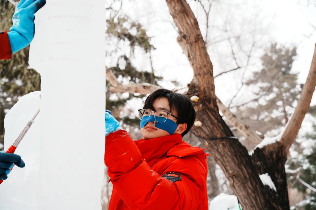 时值深冬,哈尔滨气温骤降,兆麟公园赛场内外寒风凛冽、天寒地冻,但极端的天气丝毫没有击退参赛师生的热情与斗志。同学们怀揣着对冰雕艺术的赤诚热爱与执着追求,以冰为纸、以铲为笔,全神贯注投入创作。创作过程中,辛明明老师全程跟进指导,结合专业知识为同学们点拨思路、破解技术难题,助力团队将专业所学与艺术创意完美融合,全力展现最佳创作状态。