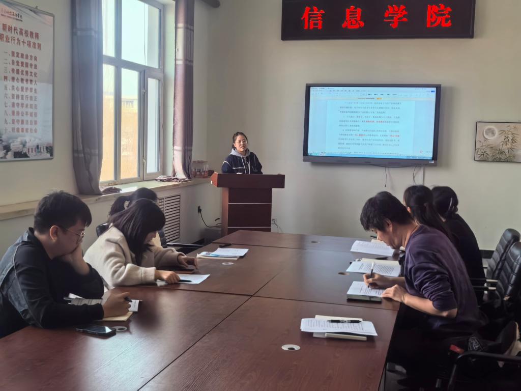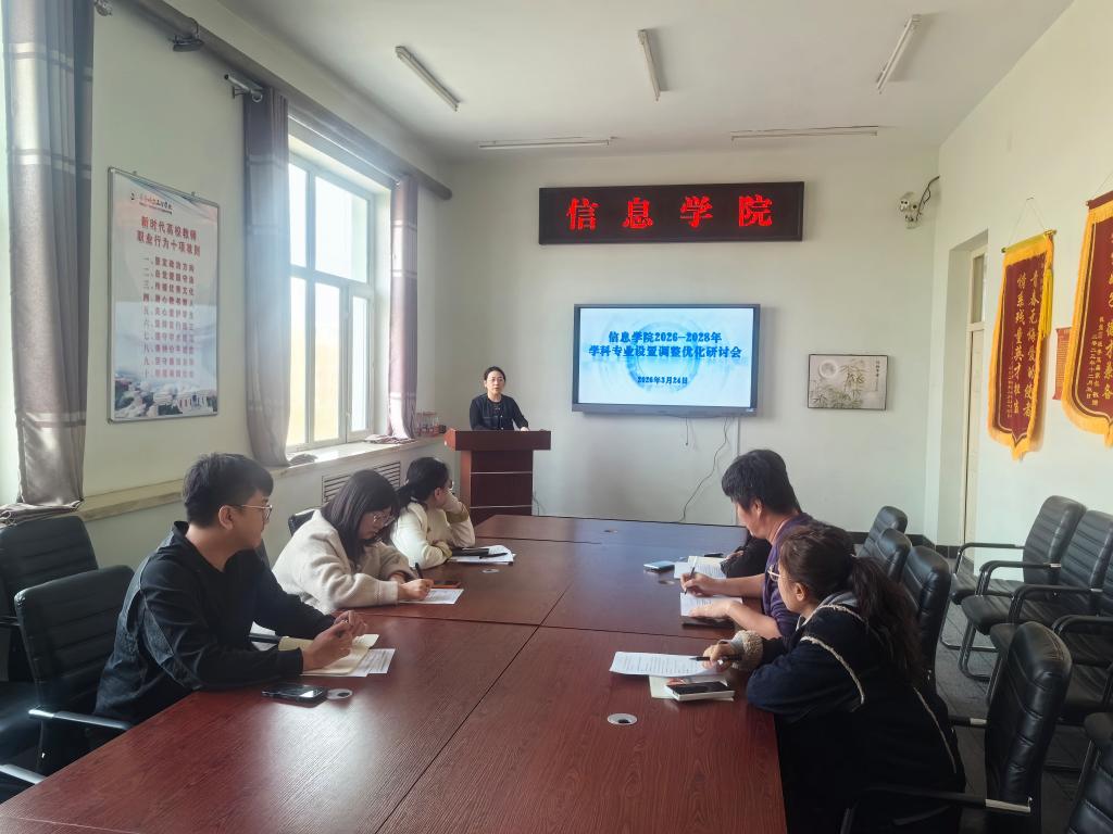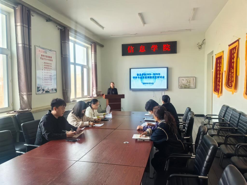 为深入贯彻落实我省高等教育学科专业设置调整优化工作的的战略部署,主动对接区域产业发展需求,科学谋划学院未来三年专业建设方向,3月24日上午,信息学院在一号教学区2406会议室召开学科专业设置调整优化工作会议。会议由学院副院长刘春媛主持,学院院长郝丽娜及各专业负责人参加会议。