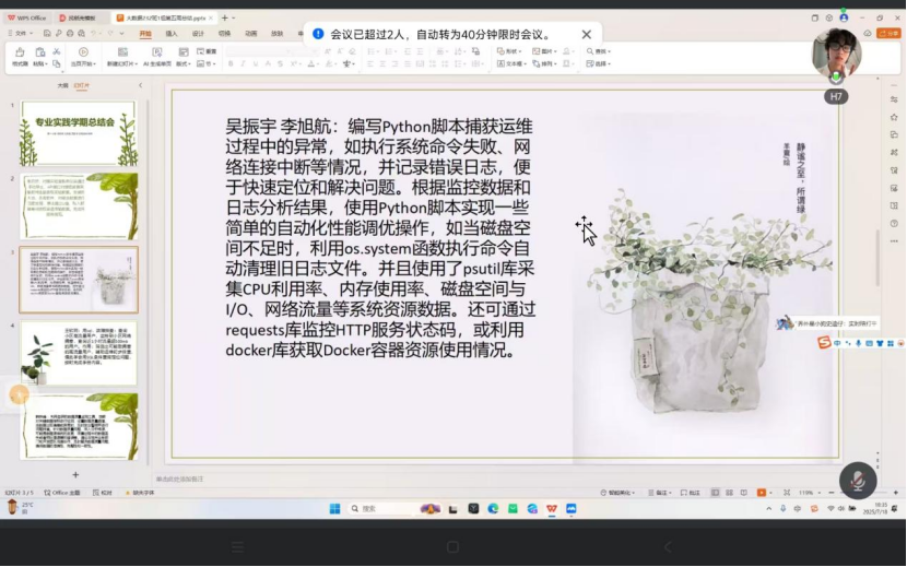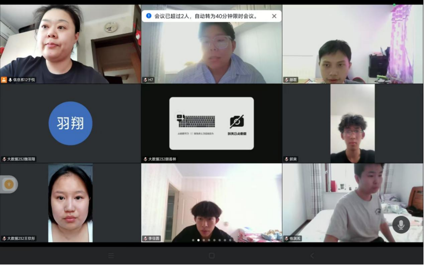 7月18日,大数据 232班专业实践学期第五周线上总结会顺利召开,本次的线上会议由指导老师于悦以及辅导员杨佳佳老师共同主持会议,大数据232班共计51名同学全员参会。