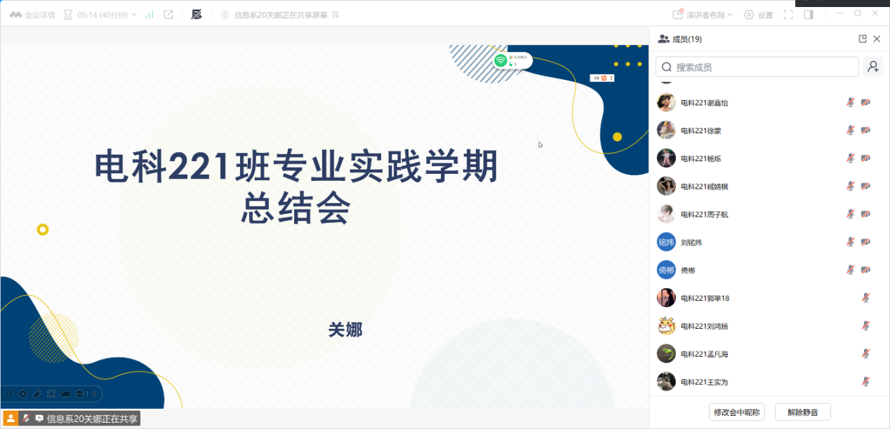 7月18日,专业实践学期指导教师关娜为电科221班全体学生召开了专业实践学期阶段班会。本次班会由关娜老师主持,班会旨在进行专业实践学期阶段总结强化实习期间的安全意识,指导学生实践,并探讨毕业相关事宜。