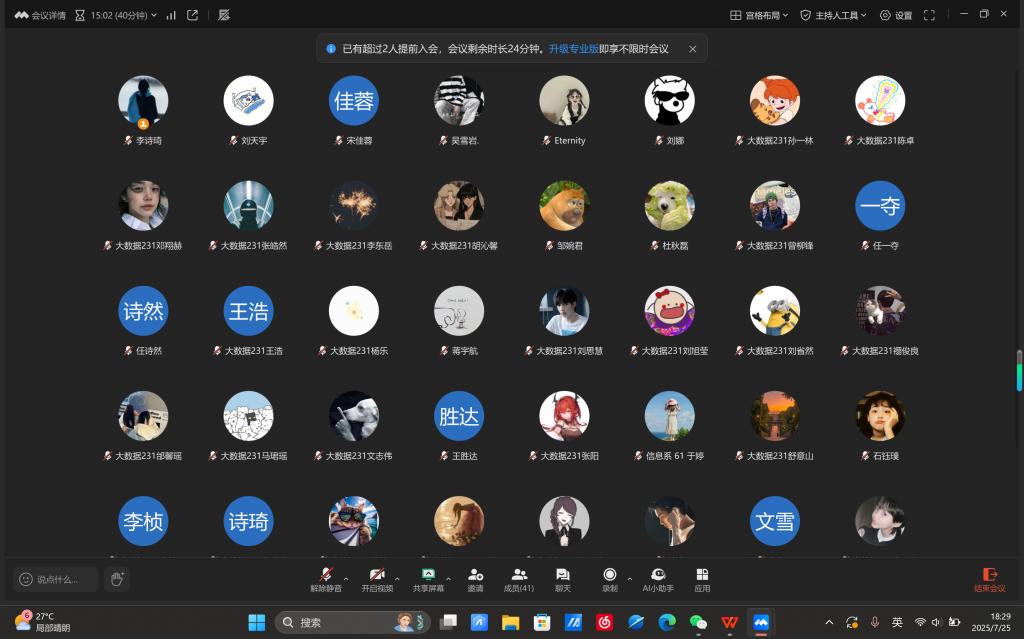 7月25日下午,随着专业实践学期进入收尾阶段,大数据231班召开实践总结会,本次会议由大数据231班专业实践学期指导教师于婷主持,共45人参加此次会议。