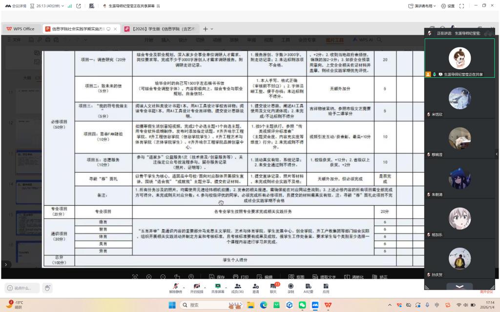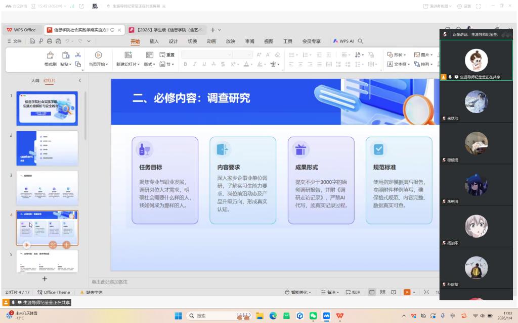 为扎实推进2025-2026学年社会实践学期相关工作,引导学生明确实践任务、强化安全意识,1月4日,生涯导师纪莹莹组织所指导学生召开社会实践学期动员暨安全教育专题线上会议。