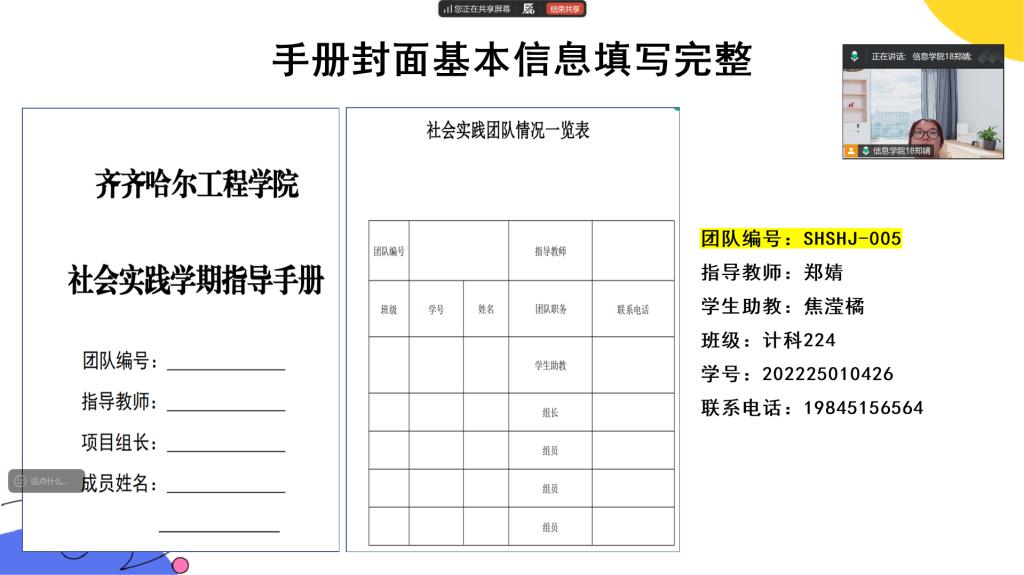 首先,郑婧老师简要说明社会实践学期的目标与规划,并强调了社会实践学期的意义与重要性,特别是安全问题。接下来,她按照实践学期必修和选修内容进行细致讲解,要求同学们按照手册规定的内容完成实践。最后,郑老师鼓励同学们在社会实践学期遇到困难要及时与老师、学长沟通并解决,希望同学们在接下来的社会实践学期中继续保持高昂的斗志与饱满的热情。