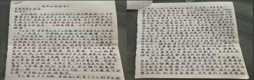 本次活动旨在通过交流分享,相互鼓励,共同树立清晰的职业目标,以书信承载青春期许,留存当下奋斗初心。首先,同学们结合电子商务行业的岗位需求与发展前景,交流了各自的职业规划,同学们纷纷表示要重视专业技能提升与实践经验积累;随后,同学们讨论了书信撰写的小技巧,相互鼓励写下毕业时的具体目标,比如计划要掌握的专业技能、计划要考取的职业证书、期望的就业方向等;最后,电商232班秦绪杰同学分享了自己对跨境电商岗位的向往,杨金瑶同学则写下了创业相关的规划并现场分享了自己的书信草稿,引发了同学们的讨论和共鸣。