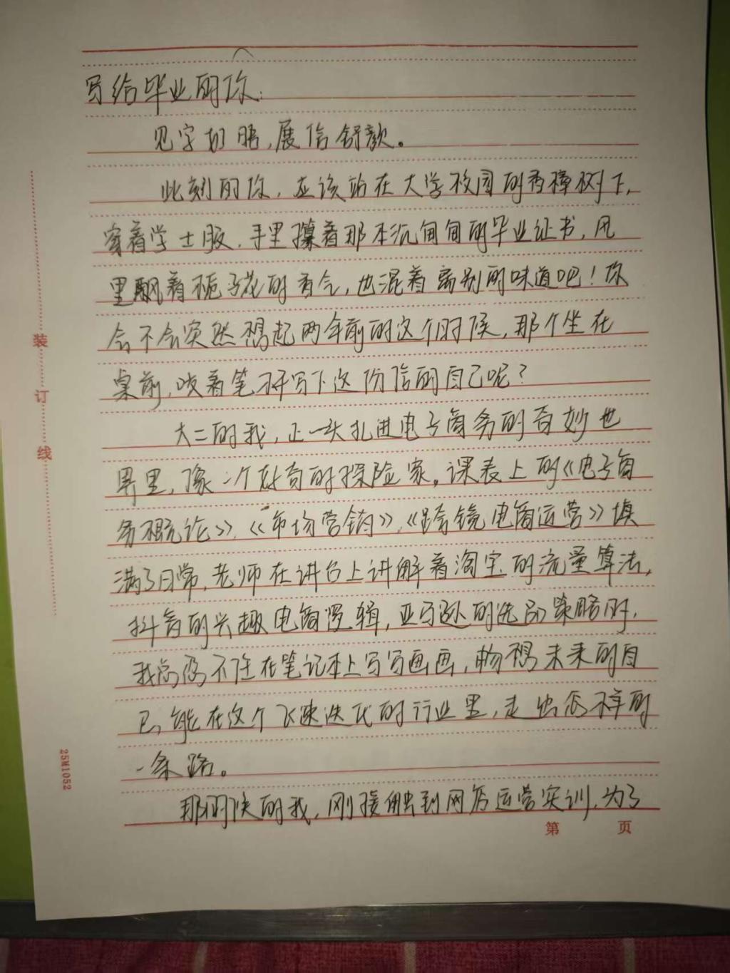 组长电商241班张孜轩在信中写道:“电商的浪潮永远在变,但对用户价值的追求不会过时。”她回顾专业学习中“试错与迭代”的感悟,将课堂上打磨的运营方案、分析的用户数据视作成长底气,畅想未来投身电商核心项目或创业的可能,寄语自己“历尽千帆,归来仍有赤子之心”。