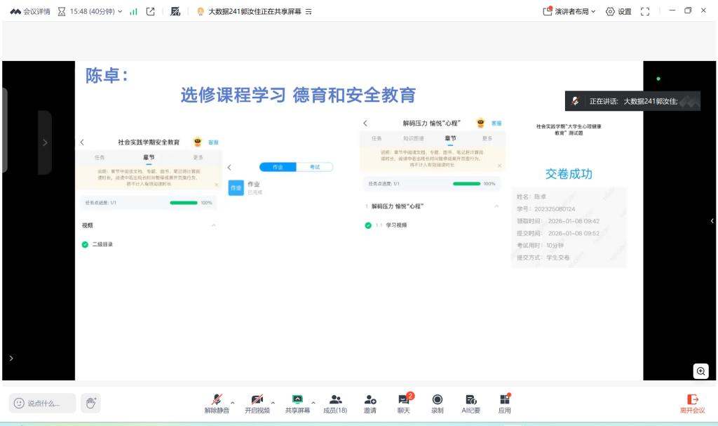 首先,陈卓明确本次课程学习的核心目的,强调德育与安全教育对社会实践开展的重要性,介绍了 “线上专题学习 + 课后测试巩固” 的学习形式,明确了一周内的学习任务与时间节点,确保组员有序推进学习。