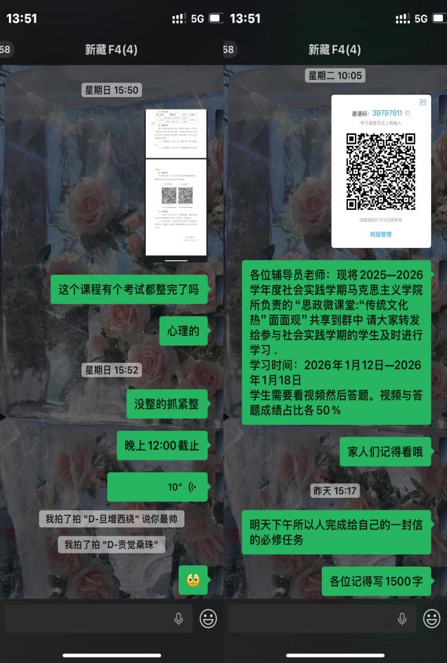 首先,小组按学校要求推进,思政微课堂学习任务。群内转发了马克思主义学院共享的学习二维码与邀请码,明确学习时间为2026年1月12日至1月18日,需完成视频观看与答题环节,且视频和答题成绩各占50%,成员们已着手跟进该线上学习任务。