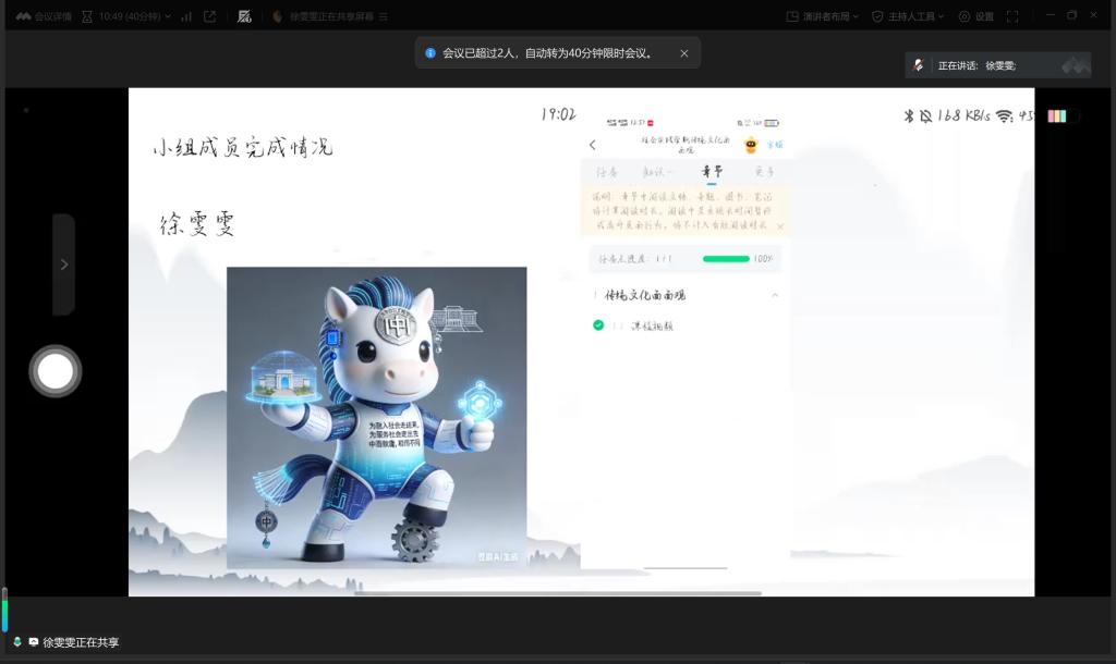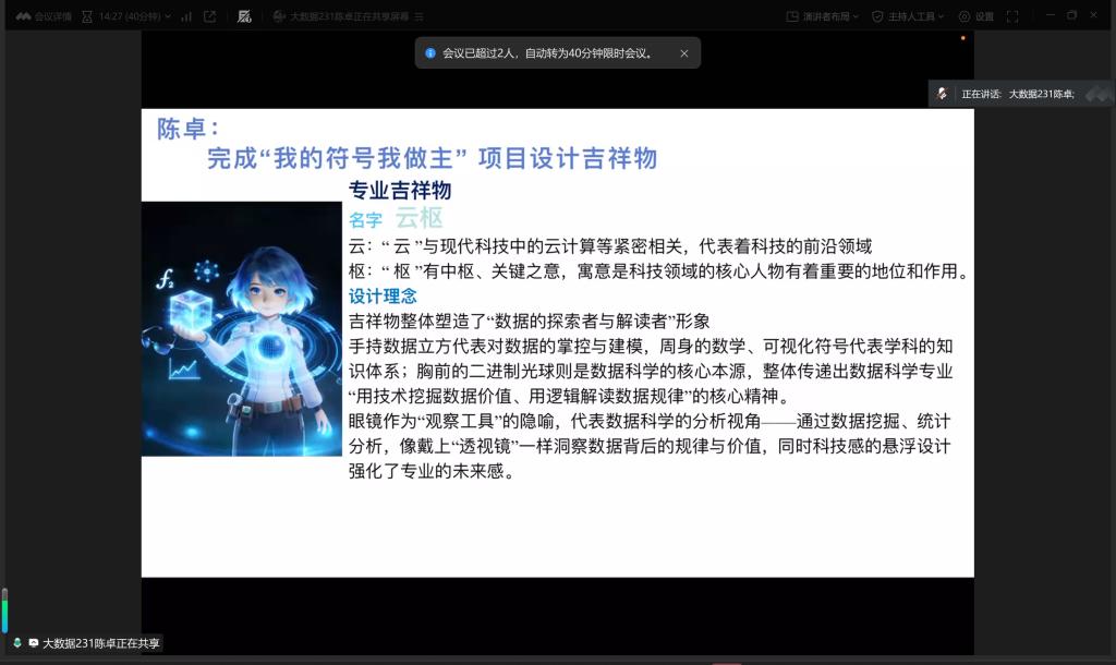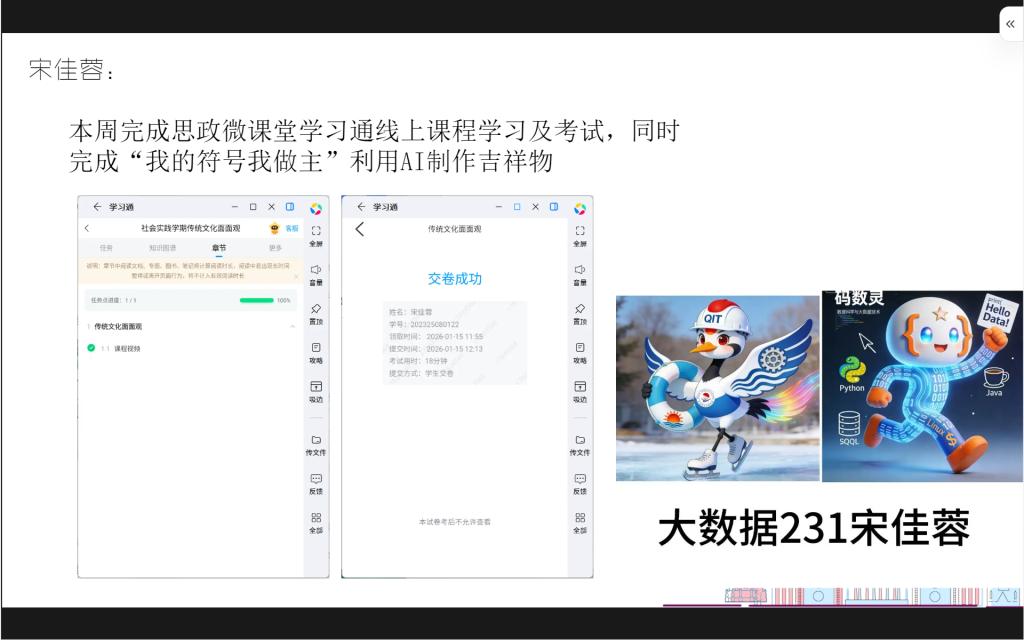 第五组袁馨组(计科231袁馨、计科251曹江宏、计科252田佳妮、计科252吴超超),本周高效完成多项特色任务,聚焦“我的符号我做主”主题,利用AI技术开展双吉祥物制作工作,在技术运用与创意构思的结合中展现团队风采,以务实行动为实践学期开好局、起好步。