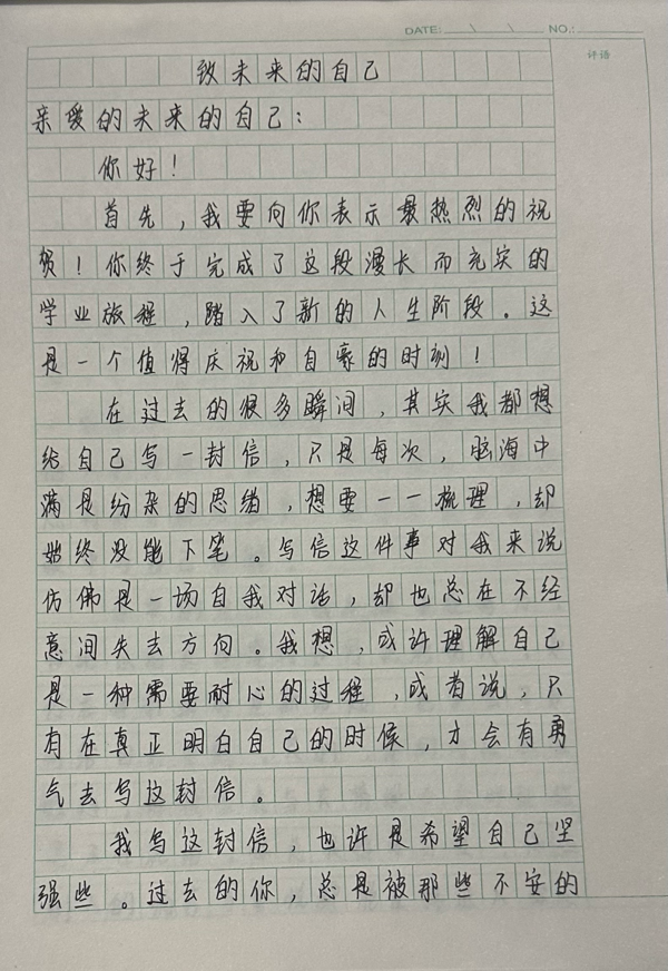 最后,王博同学及小组成员顺利完成书信撰写,信中以 “现在” 与 “未来” 双重视角展开叙述,记录了当下的成长状态与对未来的期许。