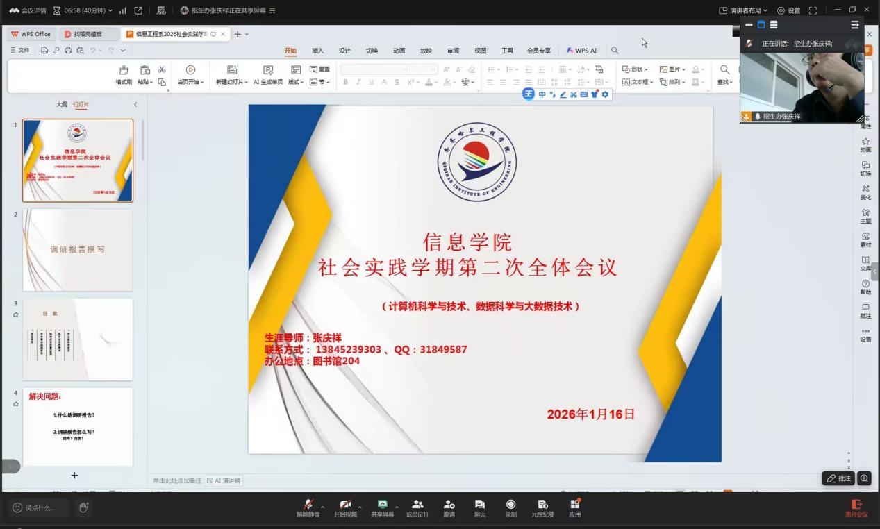 1 月 16 日下午,信息学院生涯导师张庆祥通过线上平台召开社会实践学期第二周指导会议,各实践小组成员参与此次会议。