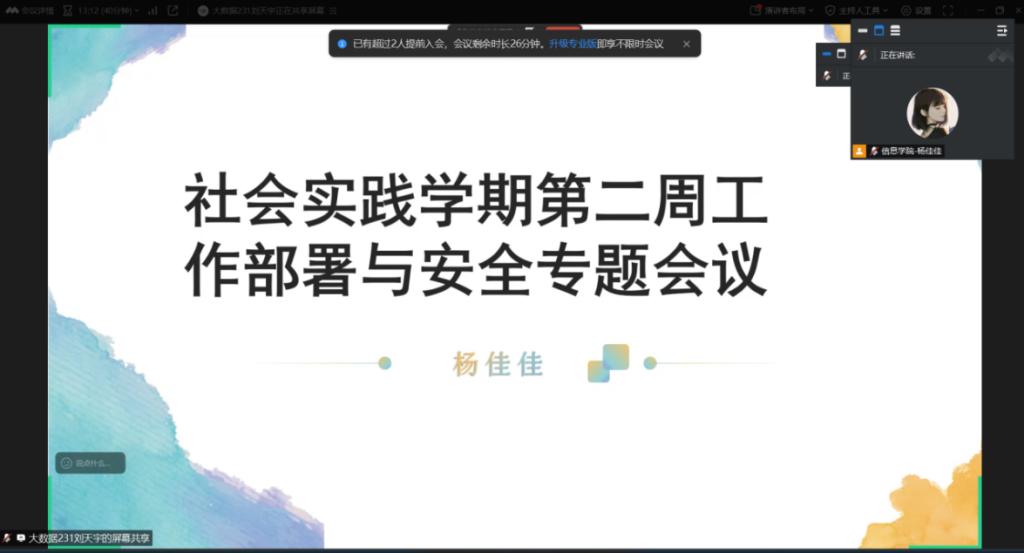 1 月 15 日下午,信息学院大数据 23 级、计科 23 级及计科专升本 241 班联合召开社会实践第二周工作部署与安全线上专题会议。会议由辅导员杨佳佳主持,6 个班级全体同学、生涯导师通过线上平台同步参会,旨在规范第二周实践工作流程、强化安全防范意识,确保寒假社会实践平稳有序推进。