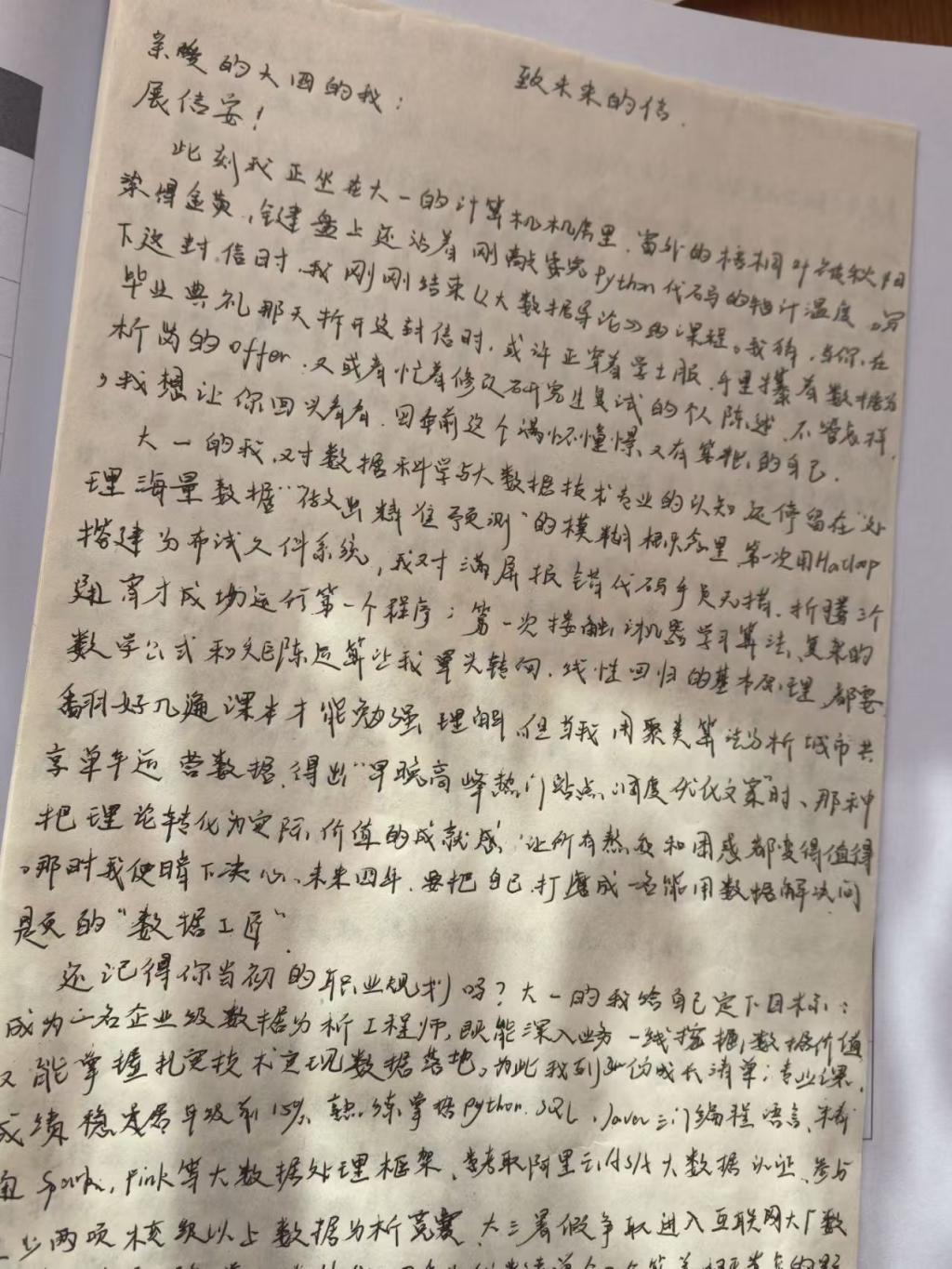 其次通过给未来的自己写信,学会了直面内心的情感,清晰地表达出对未来的憧憬、担忧与期许,让内心的想法有了具象的表达,提升了情感梳理和文字表达的能力;写作过程中,对当下的成长状态进行了全面的回顾,明确了自身的优点与不足,更加清晰地知道自己想要什么,该如何努力,树立了更明确的成长目标。