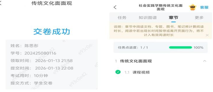 其次,集体任务方面,三人共同参与了社会实践学期 “传统文化面面观” 的线上视频学习与线上考试。学习过程中,他们依托线上平台,合理规划学习时间,同步研读传统文化相关视频课程,深入探讨传统习俗、文化遗产等核心内容,相互分享学习心得与答题技巧。面对线上考试的要求,三人沉着应考、认真作答,最终凭借扎实的学习积累顺利通过考核,不仅深化了对传统文化的理解,更提升了线上协作学习的能力。