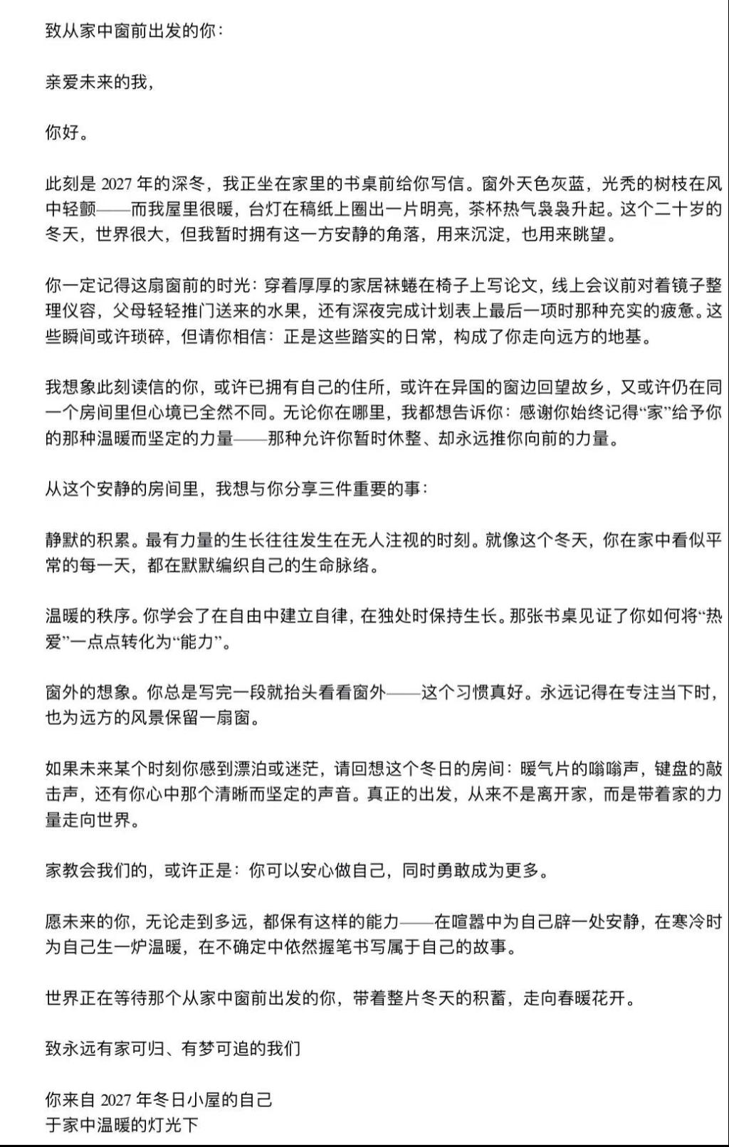 其次,安博闻与赵芷曼聚焦必修项目《致未来的信》电子版书写。两人依托前期研讨框架,系统整合在校学习收获、实践经历与专业认知,将职业规划、能力提升目标与真情实感融入文字,同时严格遵循格式与字体规范,反复打磨核对,确保内容详实、排版工整,顺利完成电子版定稿,为后续存档展示做好准备。