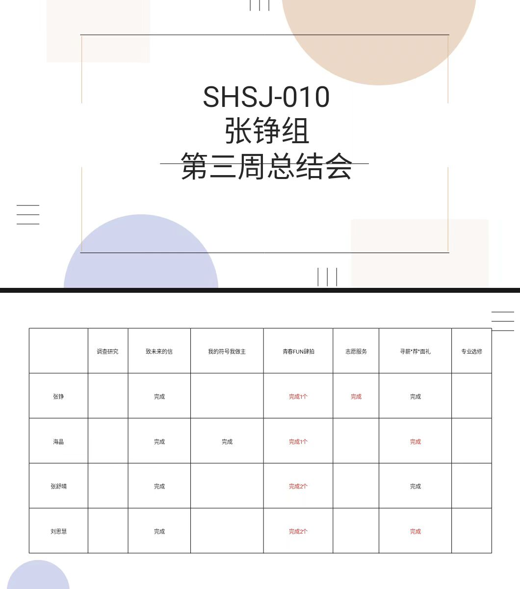通过此次总结会,张铮小组全面掌握了第三周各实践项目的推进全貌,清晰明确了后续工作的重点方向与具体分工,进一步强化了成员间的协作配合意识,有效打通了工作衔接堵点,为接下来社会实践项目的高效、有序推进筑牢了坚实基础。