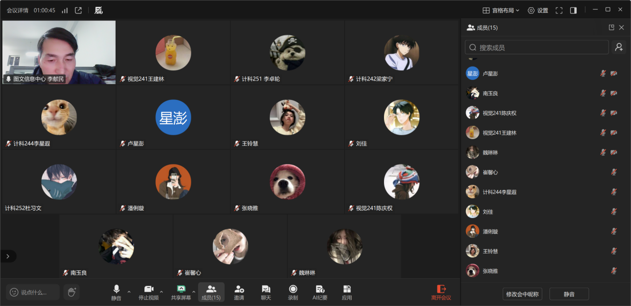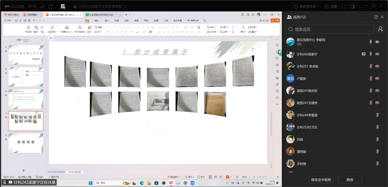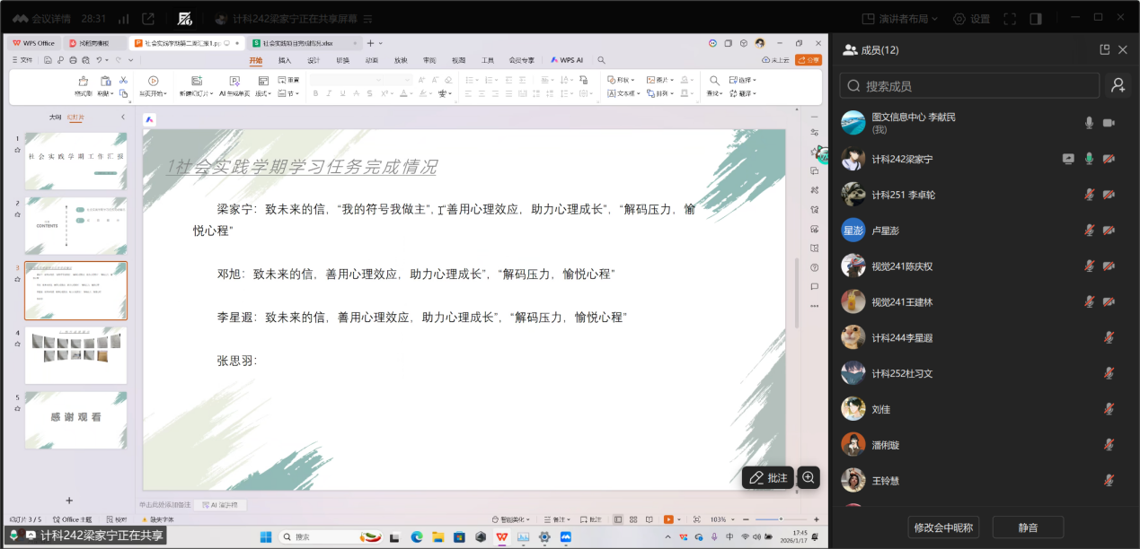 2026年01 月 17 日17:30,计科、视觉专业社会实践学期第二周总结交流会通过腾讯会议线上召开。本次会议由指导教师李献民主持,15 名专业学生参与,旨在总结本周实践任务完成情况,明确后续工作要求,聚焦设计类项目核心要点展开指导。