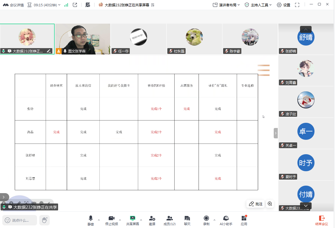 1月23日下午,SHSHJ-010组在腾讯会议平台召开2025-2026学年社会实践学期第三次社会实践阶段总结会,由指导教师张学森主持,小组全体12名成员参加。