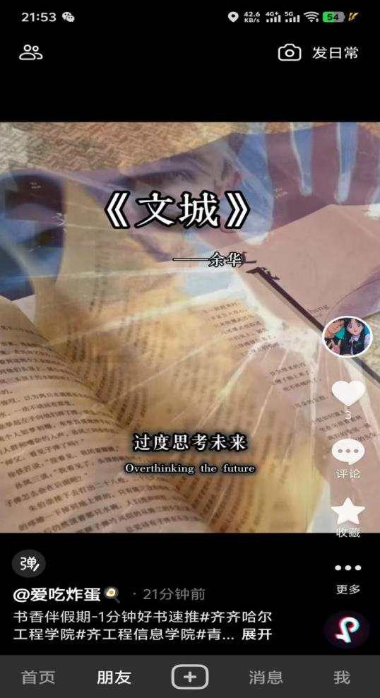 其次,组员们开展了读书分享环节。石小龙分享了书籍《文城》,结合书中人物命运与时代背景,交流了对苦难与温情的理解;蔡元分享了《平凡的世界》,探讨了普通人在大时代历史进程中所走过的艰难曲折的道路,二人还将分享内容制作成短视频发布在抖音平台,扩大了学习影响。