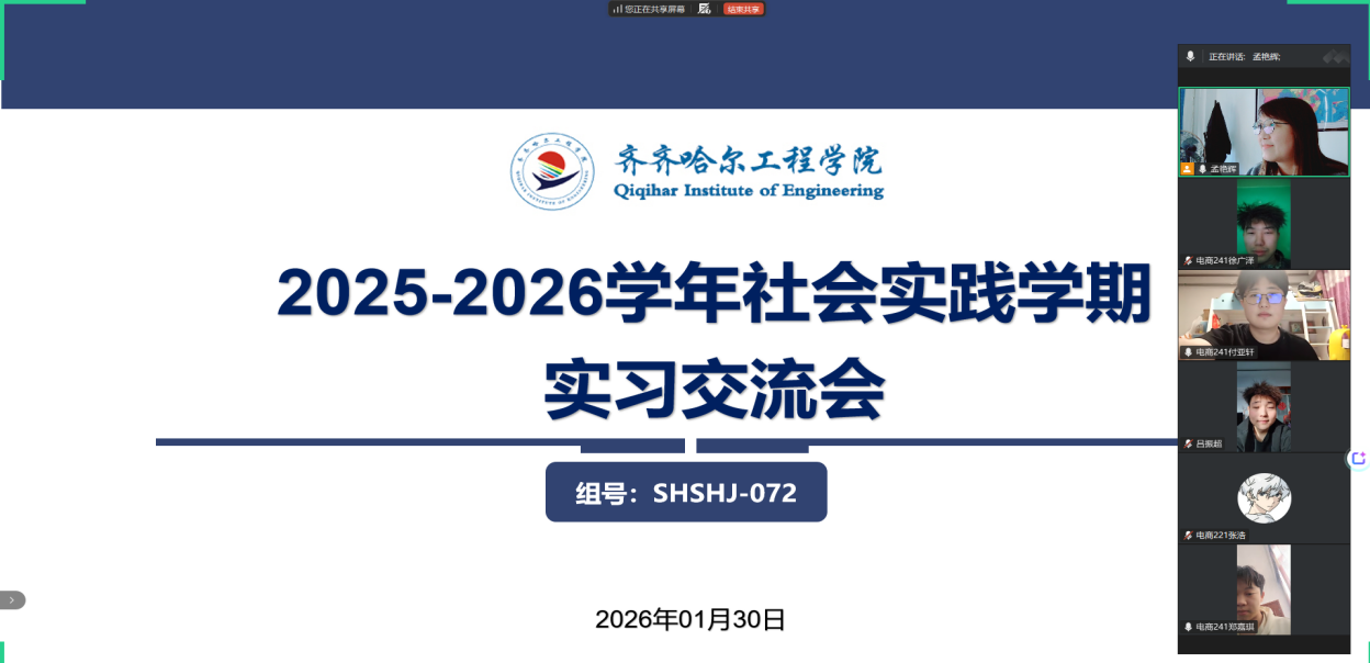 1月30日下午,SHSHJ-073组召开2025-2026学年社会实践学期第四次实习交流会。会议以腾讯会议方式召开,由生涯导师、实践指导教师孟艳辉主持,小组成员全员参会。会上,各小组成员再次聚焦调查研究项目展开汇报。