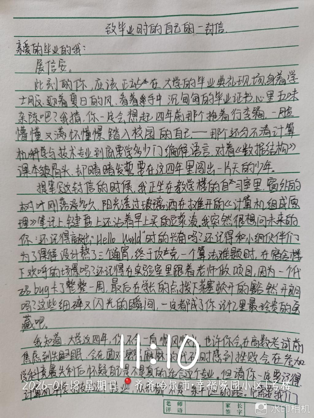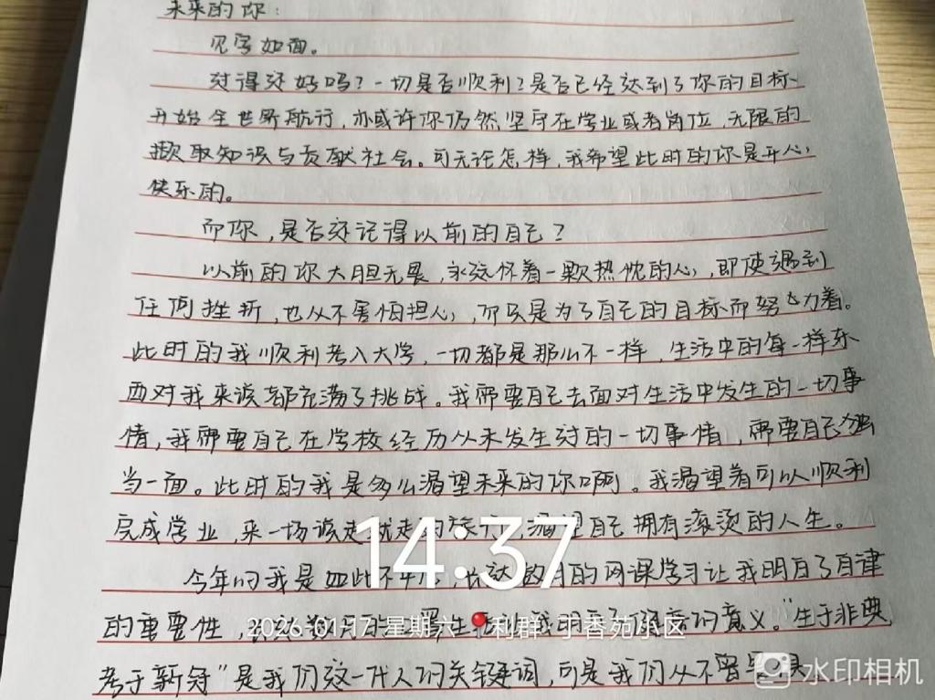 随后,小组按“书信创作+母校回访”双主线同步推进活动,各成员分工协作、有序落实,动态成效显著。在“致未来的信”创作环节,侯蕊、刘瑞、曹宇涵三位组员分别以不同视角落笔,用心勾勒成长轨迹、锚定未来方向:侯蕊结合自身在齐齐哈尔工程学院的学习体验,回顾从懵懂入学到明确专业目标的蜕变历程,书信篇幅达1500余字,情感真挚且逻辑缜密;刘瑞聚焦“成长”主题,分享实践中的收获与感悟,对未来学业提升与能力培养提出具体期许,语言朴实有力、充满奋进力量;曹宇涵结合所学专业及学校合作企业资源、微专业培训等优势,细致规划大学期间学业重点与能力提升路径,表达了未来投身行业、实现自我价值的坚定信念,内容兼具专业性与前瞻性,格式规范、字迹工整。与此同时,王鑫同学独立推进母校回访专项工作,他返回高中母校后,面向民办本科分数段的高中生及家长开展精准宣讲,条理清晰地解答了专业选择、校园生活、未来就业等常见疑问,有效传递了学校的办学理念与育人成果,获得了现场听众的积极反馈。