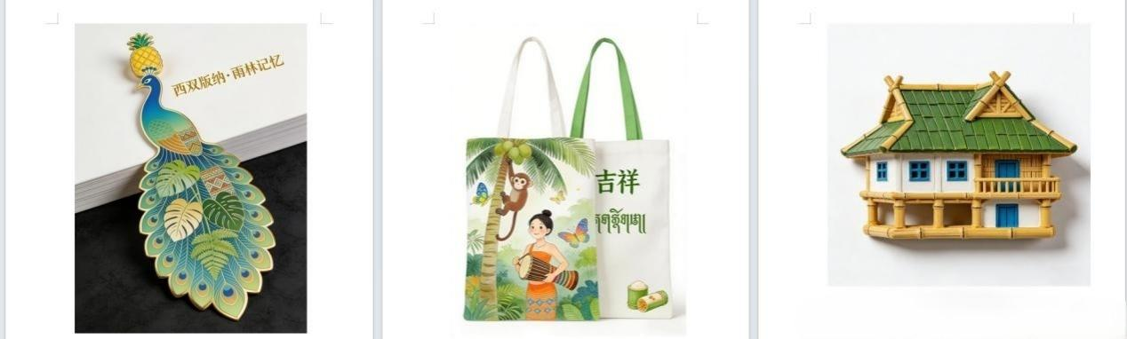 最后本次作品涵盖文创周边、视觉海报、特色摆件等,核心是传统元素与现代审美、生活场景的融合。比如西双版纳主题冰箱贴,三款各有亮点:傣家竹楼款还原“干栏式”结构,尽显地域建筑特色;水彩风款展现傣装少女、雨林动植物场景,背面点缀傣文“吉祥”与竹简饭元素;孔雀款融入几何纹样与雨林植物,蓝绿渐变搭配烫金线条,质感十足。此外,传统纹样帆布包、地域故事系列海报,也兼具文化底蕴与视觉张力。