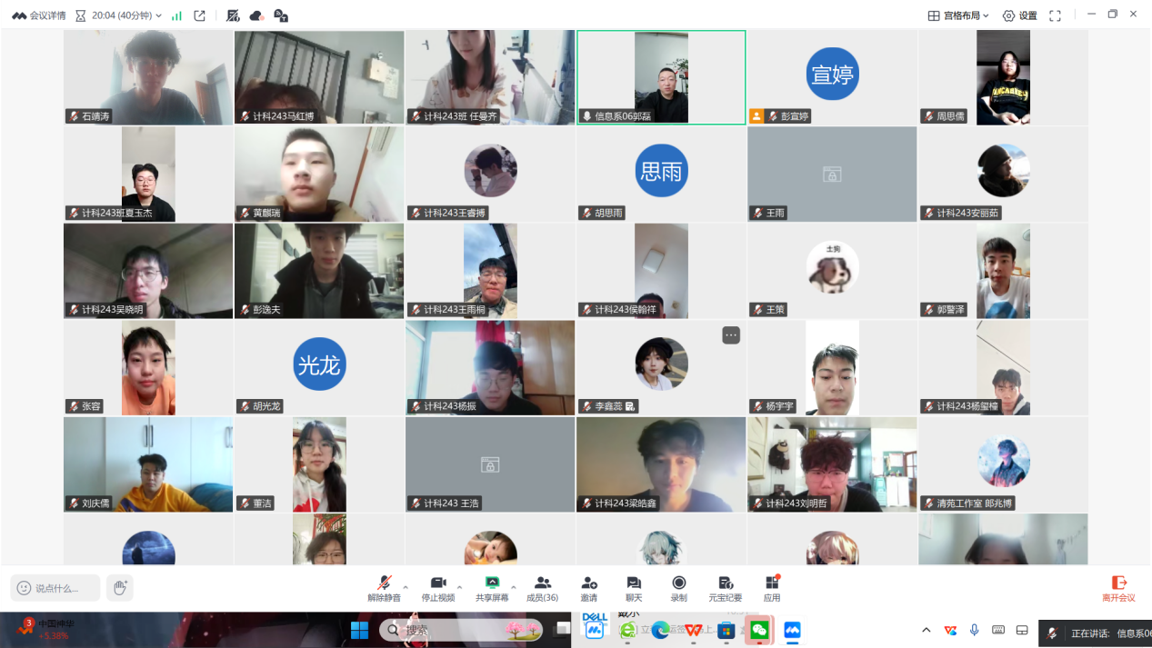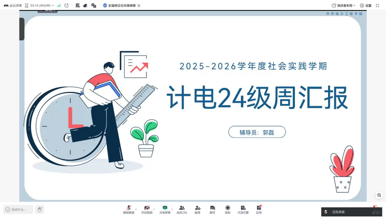 2月4日上午,为全面复盘学期内社会实践的成果与不足,梳理实践过程中的经验与问题,帮助同学们深化对专业知识的理解与应用,同时为后续实践活动的优化与开展提供明确方向,计科243班召开社会实践学期周汇报,此次会议采取线上会议的方式,由辅导员郭磊主持,班长石靖涛辅持,计科243班全体同学参加。