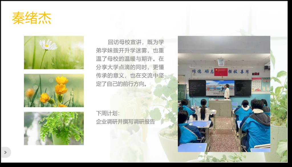 本次会议通过双抽确定汇报顺序和汇报人,各小组通过PPT进行汇报展示。本周,各组成员有序参与各类社会实践活动,汇报中,各组代表结合图文资料,细致介绍了本组在志愿服务、社会调研等实践活动中的表现和成果。此次交流为各组搭建了互学互鉴、共同提升的平台,大家在分享中相互学习优秀经验、为后续实践任务提质增效积累了有益经验。