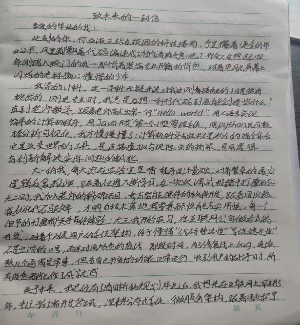 2026年2月7日彭玉鹏同学以文字为媒传递成长期许,顺利完成致未来的一封信撰写工作。信中融入实践感悟与成长思考,既记录当下实践收获,也寄托对未来的期许与规划,以真挚笔触展现青年学子的思考与担当,为实践留下温暖的精神印记。