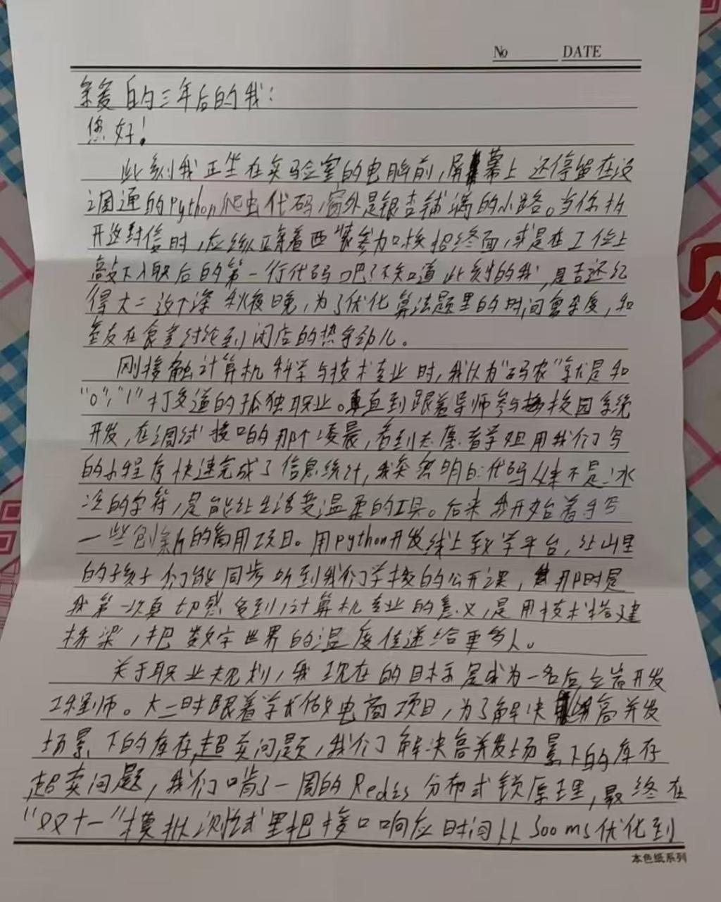 第二组李忠羿全身心投入志愿服务,严格按照相关安排落实各项服务内容,服务中认真负责、耐心细致,切实履行志愿者的责任与义务;连力冬潜心构思、执笔创作,认真完成《致未来的一封信》,将对未来的美好憧憬、成长的所思所感及前行的坚定决心凝于笔端。