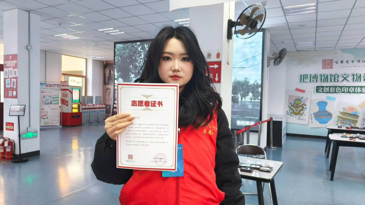 1月18日,在哈尔滨博物馆,视觉专升本251班的陈思彤同学担任志愿讲解员,为游客盖章、指引参观路线。她在充满历史底蕴的建筑里,把城市的文化故事传递给每一位游客,也在志愿服务中加深了对家乡历史的理解。她的付出,不仅获得了游客的认可,也拿到了博物馆颁发的志愿者证书。