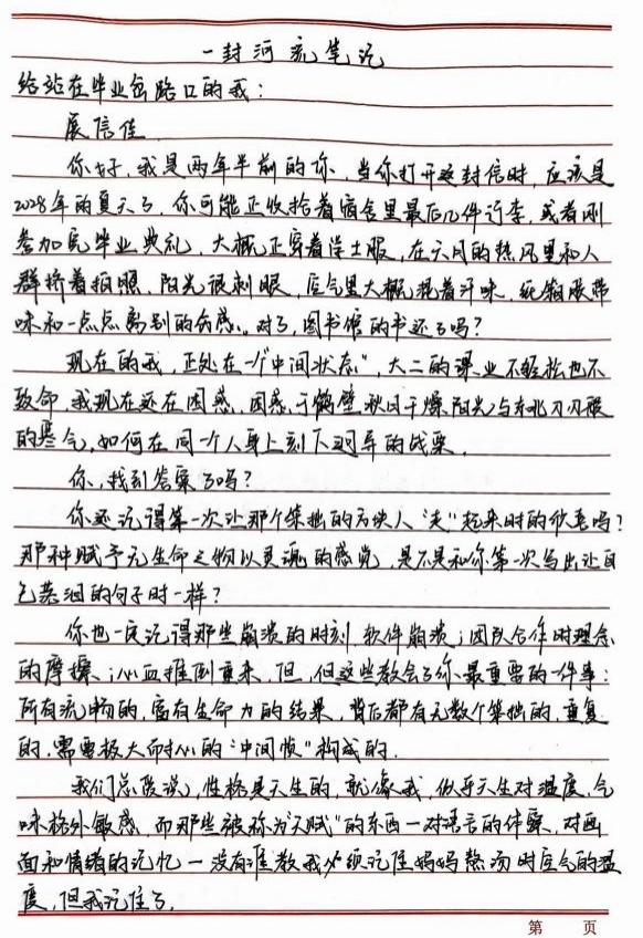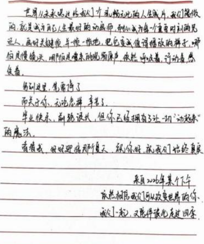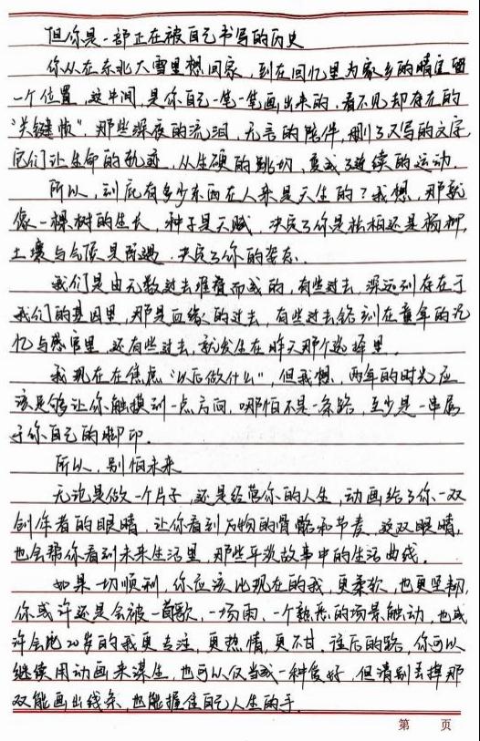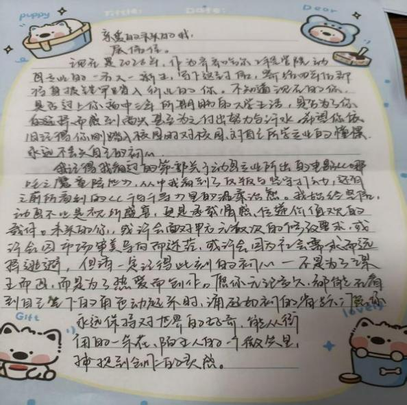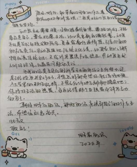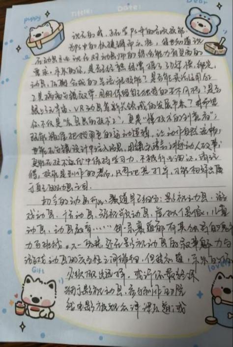在各班级的精心组织下,学生们认真投入书信创作。动画241肖迪《一封河流笔记》,字里行间满是对成长与未来的深度思考。信中回顾了大二求学的中间状态,提及东北求学的思乡情愫、团队合作的磨合与收获,将动画创作中 “赋予无生命之物灵魂” 的体验娓娓道来。以树木生长为喻,探讨天性与过往经历对人生的塑造,鼓励未来的自己以动画赋予的“敏锐眼光”直面未知,坚守热爱与行动力,既憧憬职业发展,也珍视成长路上的每一步脚印,文字兼具真挚情感与哲思。