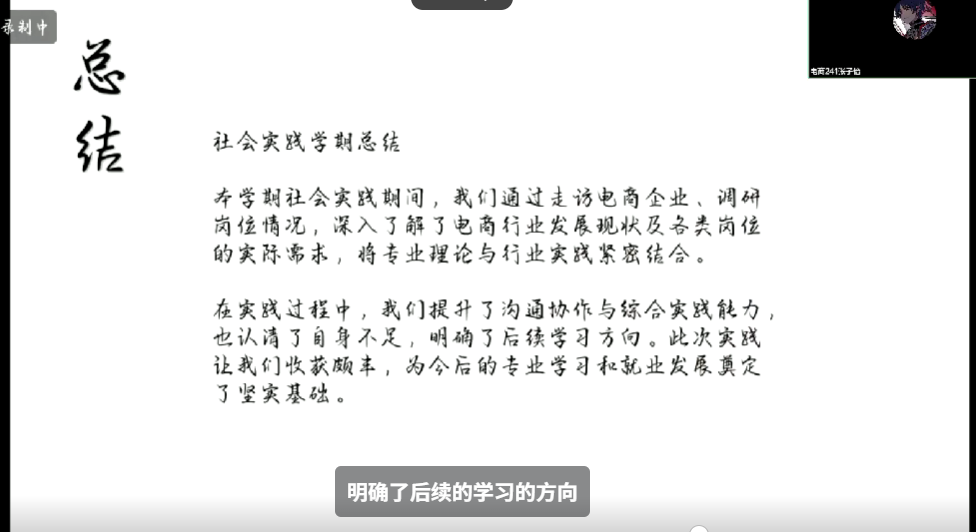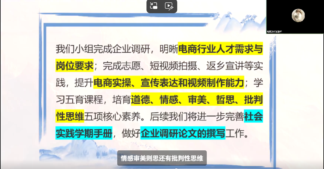 本次会议以PPT展示的形式对本次为期6周的社会实践学期活动完成情况予以汇报。首先,张孜轩小组由张孜轩同学进行汇报。张同学从完成情况、项目展示、总结三方面展开,在总结中,张同学说我们小组完成企业调研,明晰电商行业人才需求与岗位要求;完成志愿、短视频拍摄、返乡宣讲等实践,提升电商实操、宣传表达和视频制作能力;学习五育课程,培育道德、情感、审美、哲思、批判性思维五项核心素养。后续我们将进一步完善社会实践学期手册,做好企业调研报告的撰写工作。
