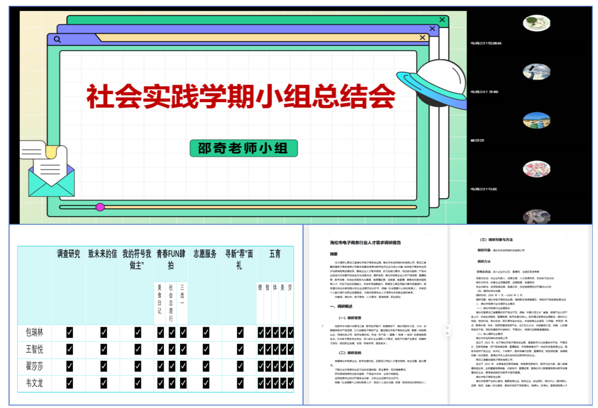 2月14日,邵奇老师组织开展了SHSHJ-080小组社会实践学期总结会,两组学生参加,本次总结会旨在复盘实践历程、交流收获感悟,并明确后续成果整理的核心要求。