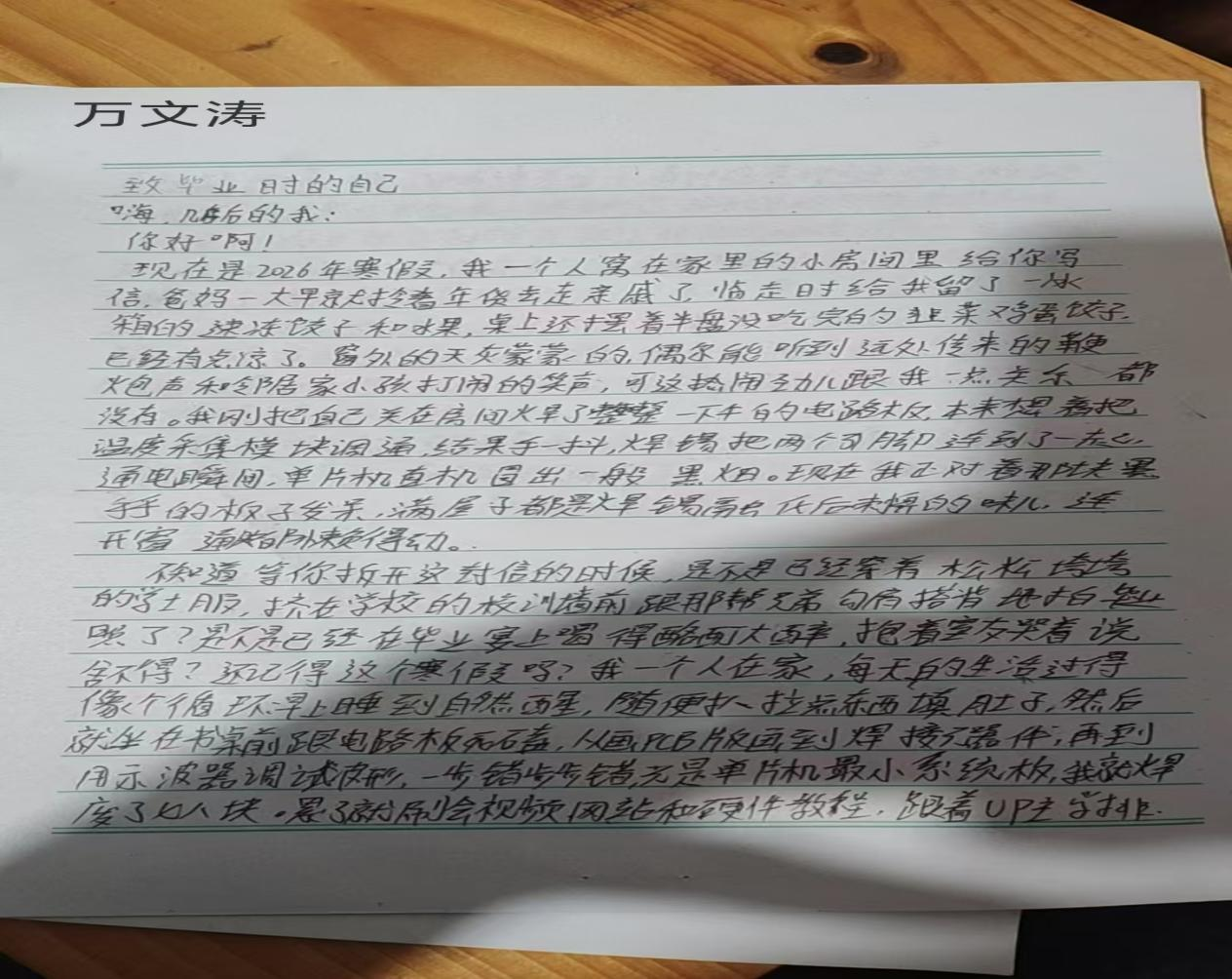 小组成员结合在校实验课中焊电路板的经历,写下对未来成为技术人的期许;回顾初入专业时的迷茫,记录下“从焊错引脚到能独立调试代码”的成长历程;大家还给自己定下“拿下四六级、深耕专业知识”的目标,希望未来的自己能成为行业里靠谱的技术人。大家在信纸上写下自己的失误,憧憬未来的职业图景,工整的字迹里满是青春的热忱与坚定。