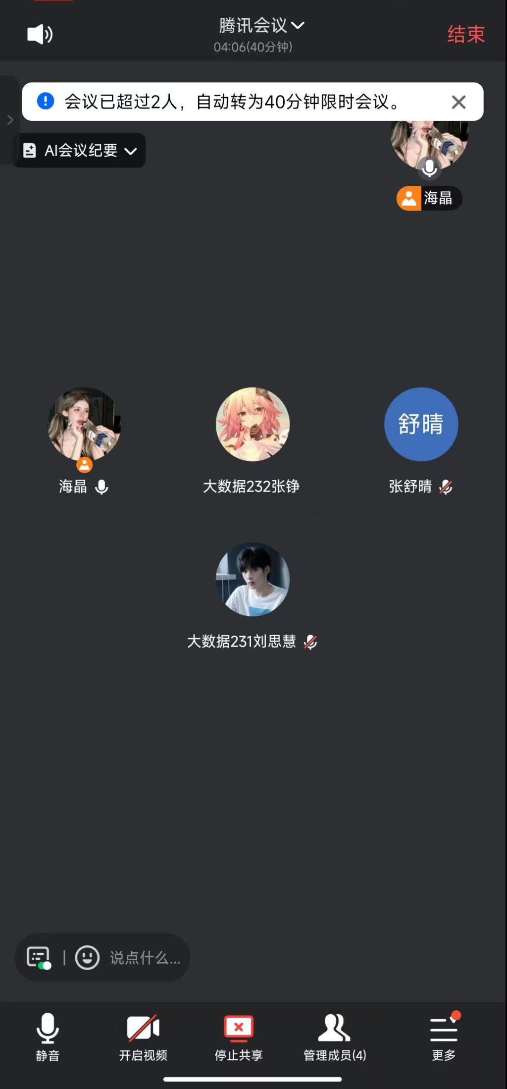 本周作为社会实践学期的最后一周,大家对作业进行整理。信息学院张铮小组召开社会实践学期总结会,由组长张铮主持,张铮、海晶、刘思慧、张舒情 4 人参加,对本学期实践成果进行全面梳理与总结。