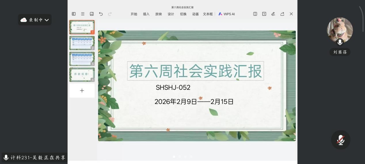 最后,各小组汇报结束后,刘茜蓓教师结合春节临近的特殊节点,对全体参会组长及组内成员开展春节安全专题强调。她要求,各小组组长要切实履行牵头职责,第一时间将安全要求传达至每一位成员,重点强化人身安全、财产安全、消防安全及出行安全防范意识,引导成员合理规划假期时间,在保障休息的同时,有序推进未完成实践任务的补做工作,坚决杜绝各类安全隐患,确保全体成员度过一个安全、祥和、有序的春节。