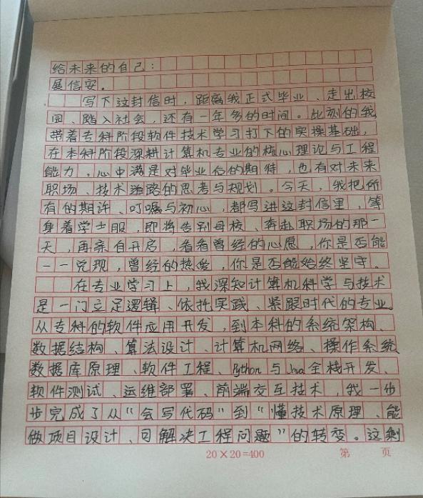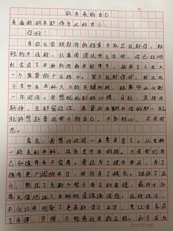 其次,刘根媛则结合自身成长经历与职业愿景,以温情笔触撰写书信。兼顾计算机专业学习的初心与个人成长的感悟,对未来的学习生活、职业发展作出清晰规划,着重阐述了如何将专业知识与实践结合,让书信既有温度又有深度,承载着对成长的思考与对未来的憧憬。