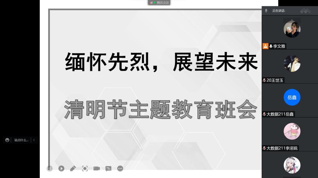首先,大数据211团支书李秋洋通过播放传统文化小视频、诵读清明节古诗、了解革命英烈事迹等方式,进行革命传统教育和爱国主义教育。随后,李文雅希望各位同学能够密切关注疫情的发展,减少外出,做好个人防护,不聚集、做好个人健康监测,时刻谨记自身安全。最后,李秋洋提醒同学们积极参与“网上祭英烈活动”,上网祭英烈,参与留言、献花,用实际行动表达对革命先烈的敬仰和追思,厚植爱党爱国爱社会主义情怀。