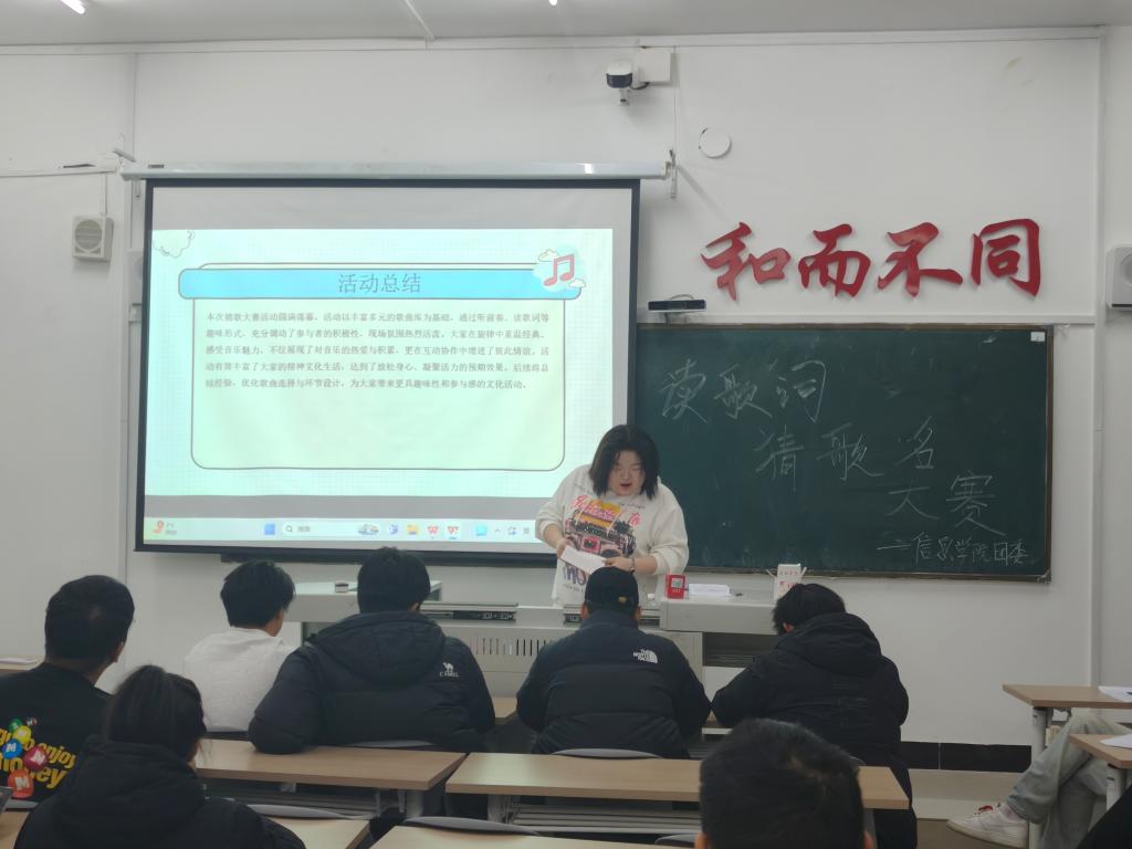 活动收尾后,现场按既定安排完成了整理工作,此次“读歌词猜歌名大赛”也作为信息学院课余文化活动的组成部分,落地了校园文化生活的丰富性建设。