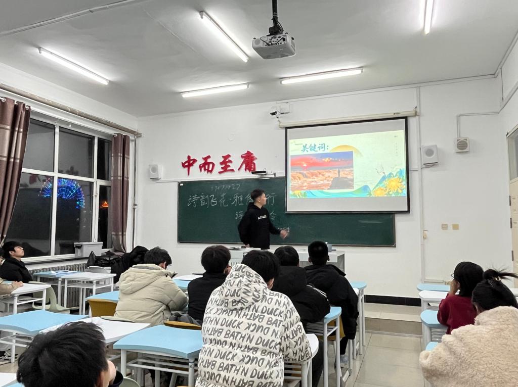 活动伊始,杜林杰同学详细介绍了飞花令的规则与流程,随后一场紧张激烈的诗词对决拉开帷幕。随后,杜林杰同学围绕“春”“花”“月”“水”等常见意象展开问答,从“春风又绿江南岸”到“桃花潭水深千尺”,从“明月松间照”到“清泉石上流”,一句句经典诗词脱口而出。其次,杜林杰同学以诗句为核心,进行看图猜诗句环节。每位同学凭借对诗句的熟悉程度,现场氛围到达了高潮,活动过程中安排了专人记分,确保活动公平公正。最后,按照得分的排名,颁发了一等奖、二等奖、三等奖。杜林杰同学表示希望通过这次活动让同学们感受到了传统文化的魅力。