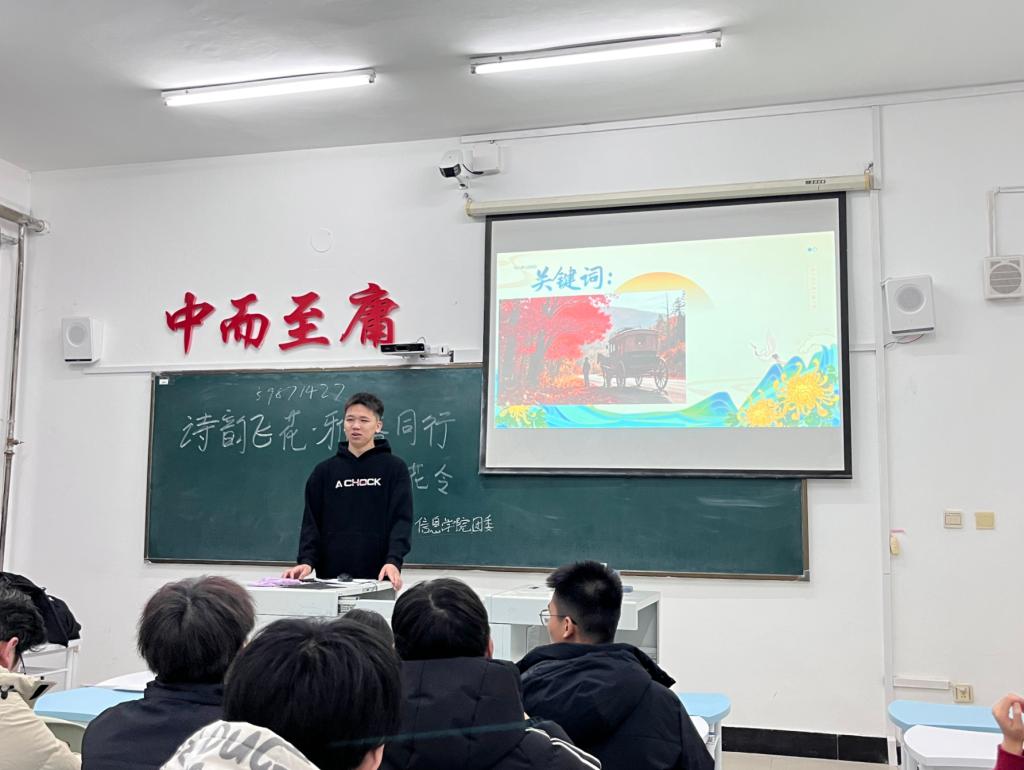 为传承中华优秀传统文化,丰富同学们的精神文化生活,搭建诗词爱好者交流展示的平台,11月20日下午,在一号教学楼1401教室信息学院团委举办“诗韵飞花·雅俗同行 诗词飞花令”主题活动,本次活动由集电241班宣传委员杜林杰同学主持,共40余人参加。