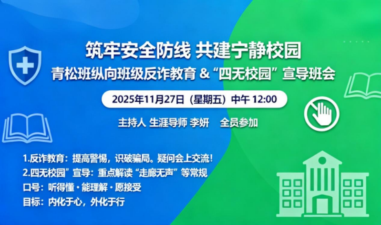 为扎实落实信息学院安全管理与学风建设工作,将学校规章制度转化为学生的自觉行动,11月27日,纵向班级“青松班”以腾讯视频会议形式召开专题班会,围绕反诈骗教育及“四无校园”建设展开深入学习。会议由生涯导师李妍主持,全体生涯学生参会,整场会议高效流畅,以有温度、接地气的育人方式,让安全意识与行为规范真正入脑入心。