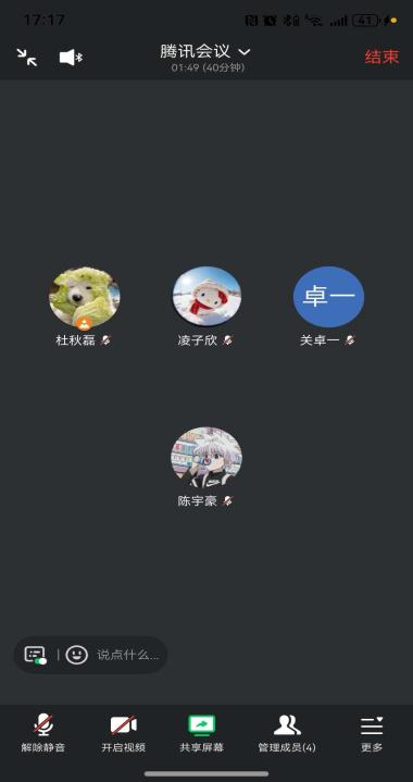 01月06日晚上,杜秋磊小组在腾讯会议平台召开第一周实践心得分享会议,由组长杜秋磊主持,小组成员凌子欣、关一卓、陈宇豪共4人参加。