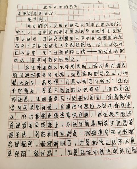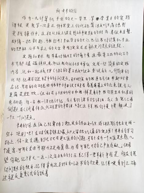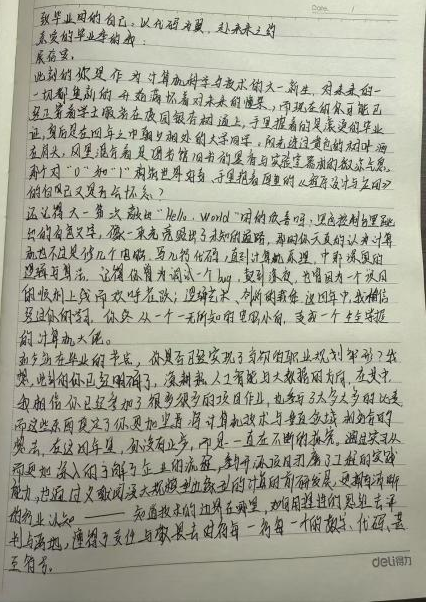 随后,小组进入主题创作环节。四位同学以纸为媒、以笔为介,褪去浮躁、沉心思考。创作过程中,成员时而相互交流思路,分享对未来的设想;时而查阅过往学习笔记,梳理成长点滴。袁馨的文字聚焦专业深耕,字里行间满是对计算机领域探索的执着;吴超超围绕个人综合能力提升展开,规划了清晰的成长路径;曹江宏结合专业发展趋势,书写了对未来职业发展的期许;田佳妮则以温暖笔触回望过往、期许平凡日子里的稳步成长,每一封信都承载着青春的热忱与对未来的无限憧憬。