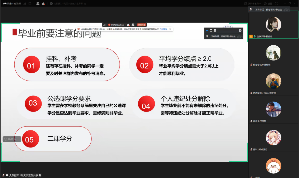 随后,大数据专业长高敏、计算机科学与技术专业长韩楠楠分别围绕学业提升与就业发展作专题指导。两位专业长结合专业特点与人才培养要求,针对课程学习、毕业设计、技能提升等关键环节提出具体建议。