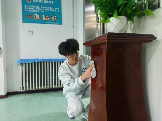 随后,志愿者与公寓干部迅速投入劳动,大家手持扫帚、抹布、拖把等清洁工具,各司其职、相互配合,仔细清扫地面杂物、擦拭公共设施、清理角落积尘,认真细致地完成每一处清洁工作。